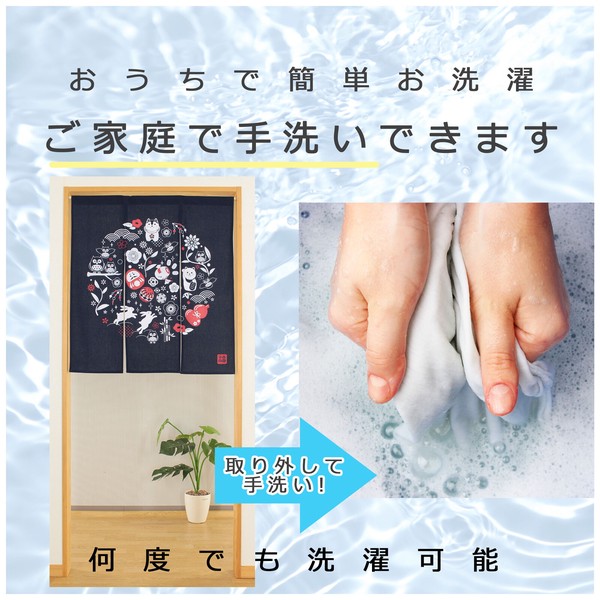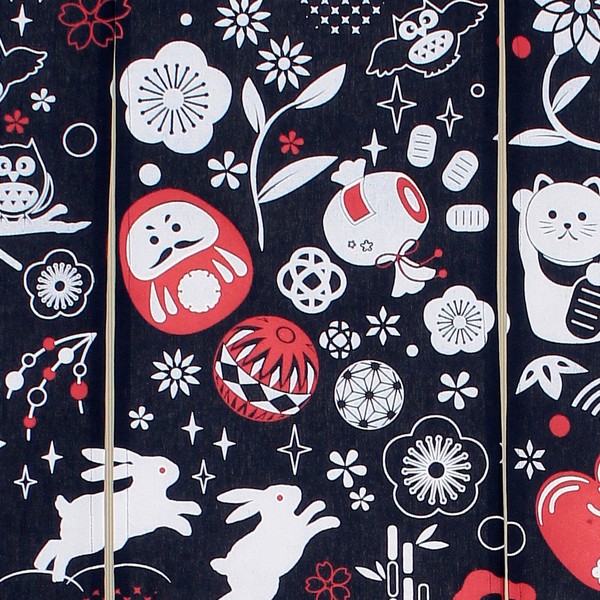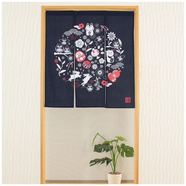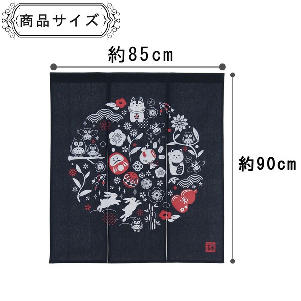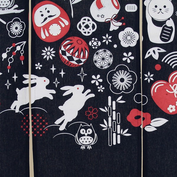 | 商品紹介 | 縁起の良いのれん 様々な縁起物がちりばめられ、華やかで活気ある雰囲気を演出しています。 ダルマ、打ち手の小づち、手まり、招き猫、雪ウサギ、ふくろう、など縁起の良いアイテムがにぎやかに配置され丸いモチーフにまとまっています。 |