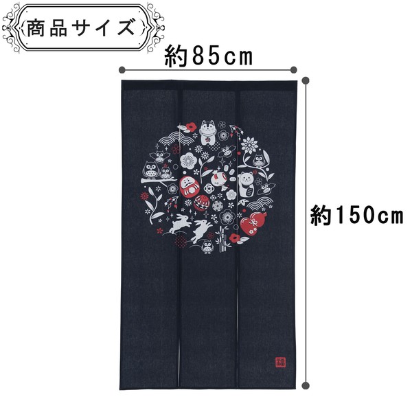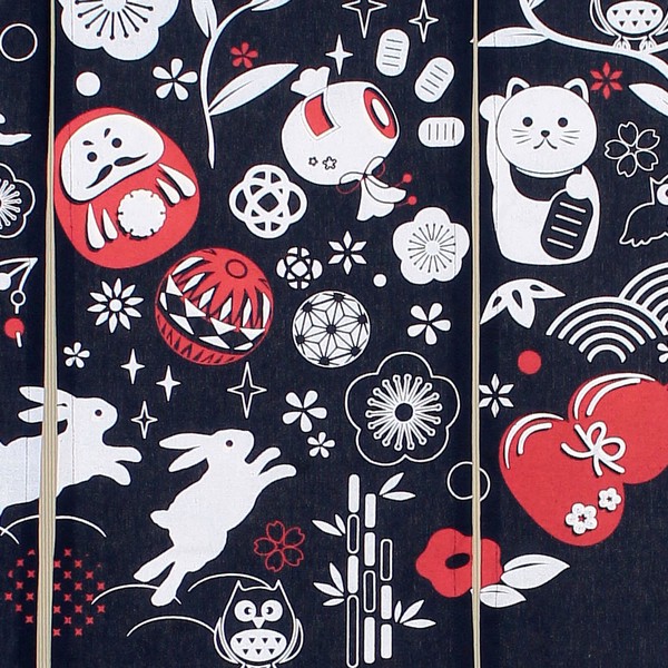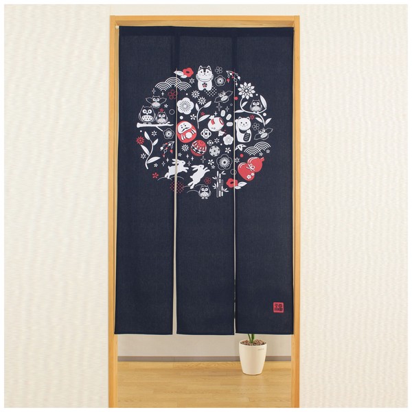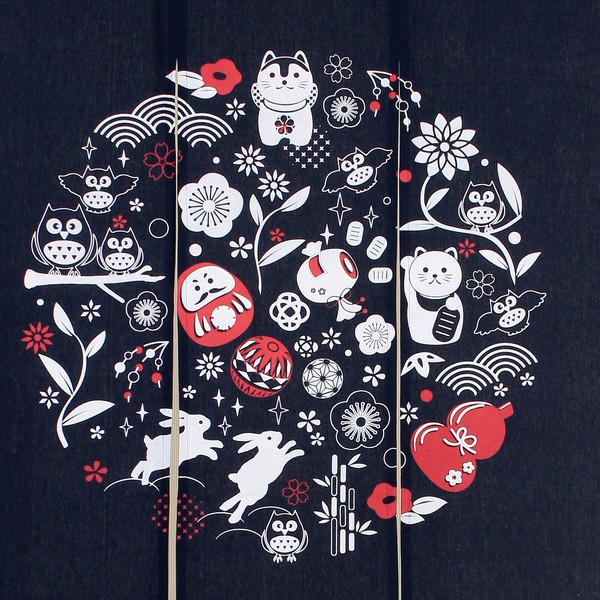| 商品紹介 | 縁起の良いのれん 様々な縁起物がちりばめられ、華やかで活気ある雰囲気を演出しています。 ダルマ、打ち手の小づち、手まり、招き猫、雪ウサギ、ふくろう、など縁起の良いアイテムがにぎやかに配置され丸いモチーフにまとまっています。 |