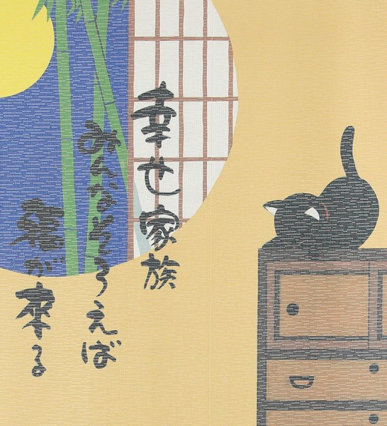 のれん 幸せ家族 猫 黒猫 月夜 紙風船 竹 和風 和柄 85×90cm