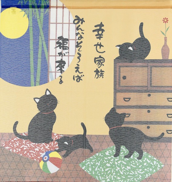 のれん 幸せ家族 猫 黒猫 月夜 紙風船 竹 和風 和柄 85×90cm