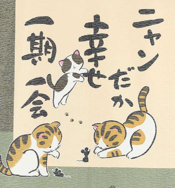 | 商品紹介 | レース生地に猫柄をプリントしました。 思わず微笑んでしまう言葉「ニャンだか幸せ 一期一会」と、 猫とねずみの愛らしい姿を描いた、心なごむ和風デザインののれんです。 生地には落ち着いた緑色を使用し、和の雰囲気をより一層引き立てています。 和室はもちろん、和モダンやナチュラルテイストのお部屋にもよくなじみます。 玄関やリビングの間仕切りとして使えば、 毎日の暮らしの中に、ふとした幸せを感じられるひとときを演出します。 |