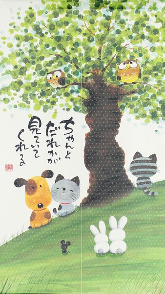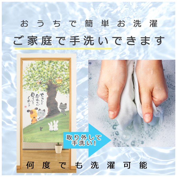 | 商品紹介 | レース生地に猫柄をプリントしました。 猫・ふくろう・犬・うさぎ・ねずみ。 木のそばや丘の上に集まった動物たちが、心あたたまる和風デザインののれんです。 添えられた言葉「ちゃんと だれかが 見ていてくれる」が、そっと心に寄り添い安心感を与えてくれます。 やさしい色合いと自然の風景が、空間を落ち着いた雰囲気に演出。 和室はもちろん、和モダンやナチュラルインテリアにもよくなじみます。 玄関やリビングの間仕切りとして、毎日の暮らしの中に癒しをプラス。 |