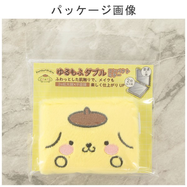 コンパクトミラー ポムポムプリン 角型 刺繍 ダブルミラー 2倍拡大鏡 イエロー 9×6.8cm